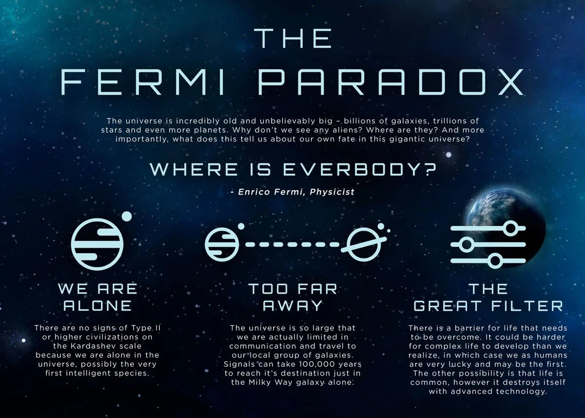 Een van de bekendste pogingen om de paradox te kwantificeren is de Drake-vergelijking, opgesteld door de astronoom Frank Drake in 1961. Deze vergelijking schat het aantal detecteerbare buitenaardse beschavingen in onze Melkweg op basis van factoren zoals het stervormingspercentage, het aantal planeten per ster, de kans op leven en de levensduur van technologische beschavingen. Hoewel de Drake-vergelijking geen exacte antwoorden geeft, illustreert zij hoe aannemelijk het lijkt dat er meer intelligent leven zou moeten zijn. De mogelijke oplossingen voor Fermi’s paradox zijn grofweg in verschillende categorieën onder te verdelen. Een eerste categorie stelt dat intelligent leven uiterst zeldzaam is. Volgens deze visie is het ontstaan van complex leven een uitzonderlijk proces, afhankelijk van een lange keten van toevallige en kwetsbare stappen. Dit idee wordt vaak samengevat in de hypothese van de “Grote Filter”. Deze filter zou een stadium in de evolutie zijn dat bijna geen enkele levensvorm weet te passeren. De Grote Filter kan zich in het verleden bevinden, bijvoorbeeld bij het ontstaan van leven zelf, de overgang naar meercellig leven of het ontstaan van intelligentie. In dat geval is de mensheid uitzonderlijk en zijn wij mogelijk een van de weinige intelligente soorten in het universum. Een alternatieve, meer verontrustende mogelijkheid is dat de Grote Filter in onze toekomst ligt. Dit zou betekenen dat technologische beschavingen de neiging hebben zichzelf te vernietigen voordat zij interstellaire expansie bereiken, bijvoorbeeld door kernoorlogen, ecologische instorting of ongecontroleerde kunstmatige intelligentie.