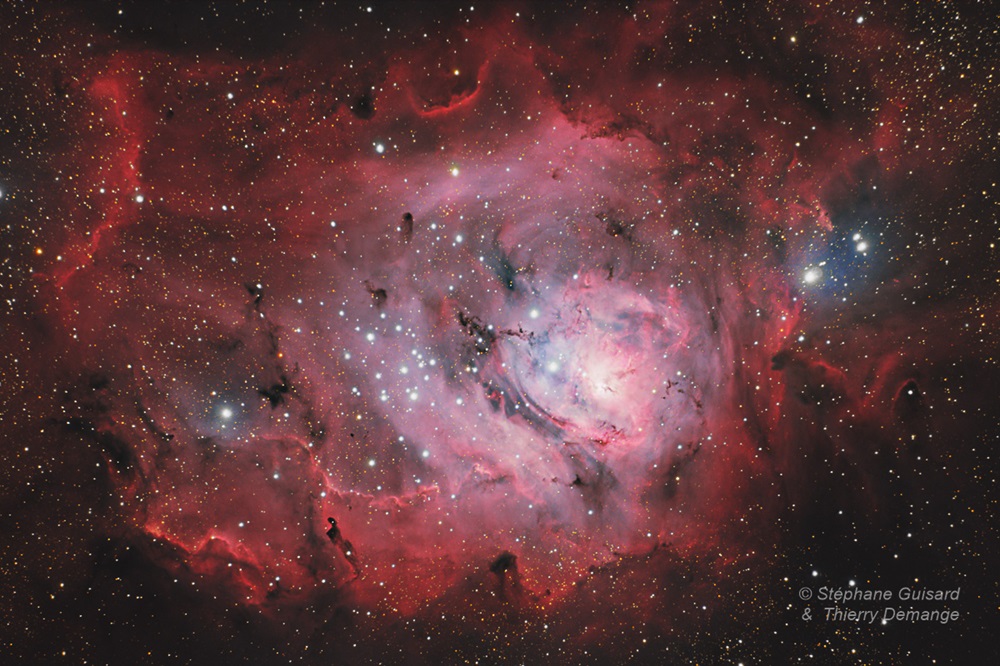 Deze spectaculaire emissienevel is een van de helderste aan de hemel met magnitude 6,0. Het is groot (90 x 40 boogminuten) en bevat de open sterrenhoop NGC 6530. Voor waarnemers in de Benelux staat M8 laag (maximaal 15-20 graden) maar is het zichtbaar met telescopen vanaf 15 cm. Een UHC of H-beta filter helpt enorm om de nevel te zien tegen de niet-volledig-donkere achtergrond. Visueel toont M8 complexe structuur met donkere gebieden (de "lagune" die het zijn naam geeft) en heldere knooppunten. De open sterrenhoop is gemakkelijk zichtbaar. Fotografisch is M8 spectaculair maar de lage hoogte in de Benelux bemoeilijkt fotografie. Langere belichtingen (3-5+ uur) en narrowband filters kunnen prachtige resultaten geven, met de roze emissienevel, donkere stofbanen, en de heldere sterrenhoop. - M20 (Trifid Nebula)