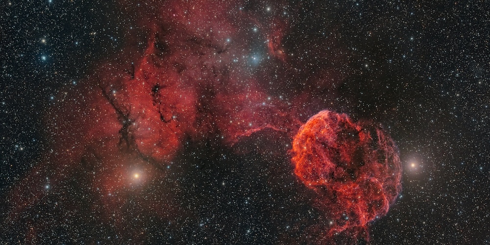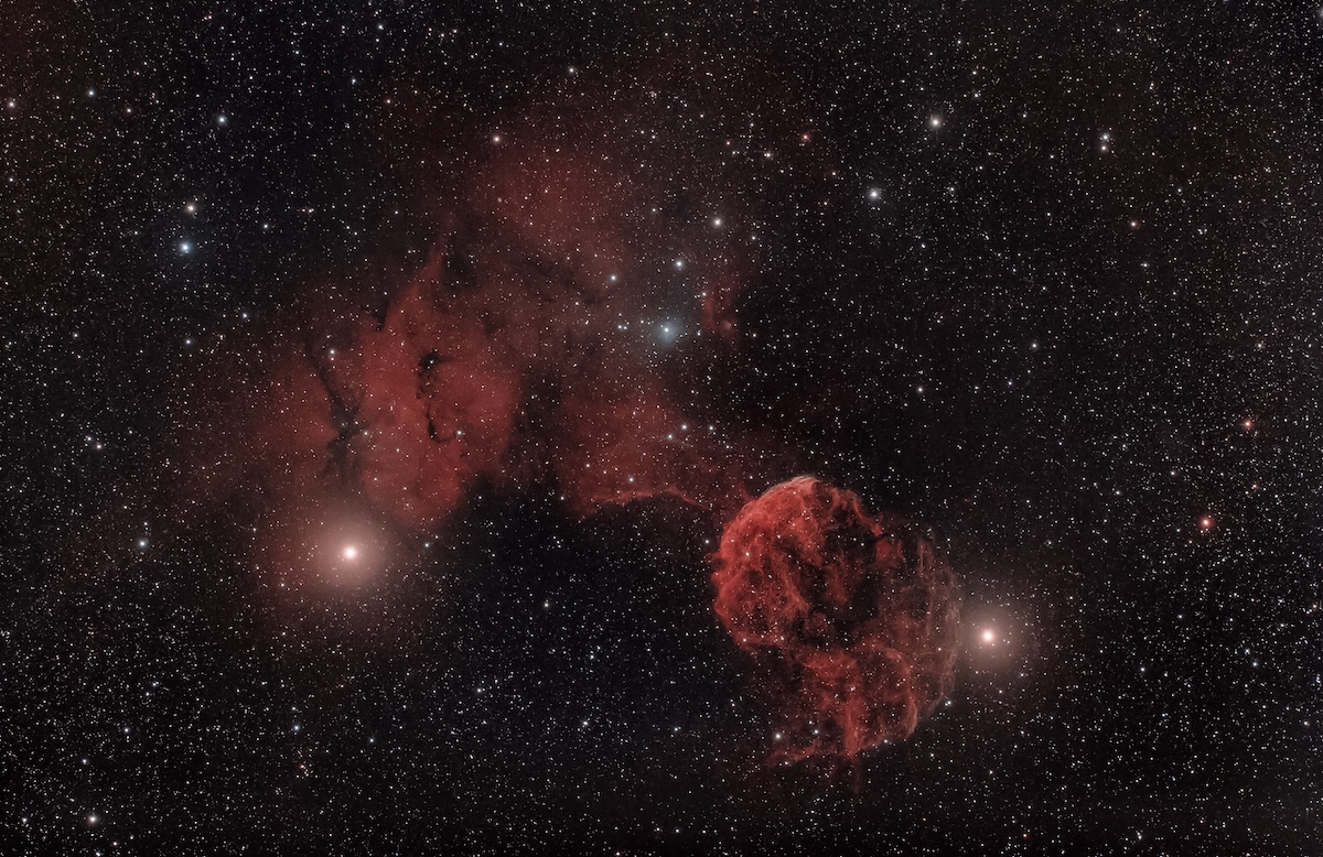 Er zijn deep-sky objecten die je versteld doen staan door hun schoonheid. Er zijn objecten die je versteld doen staan door hun omvang. En er zijn objecten die je versteld doen staan door het verhaal dat ze vertellen, een verhaal van catastrofe, van kosmisch geweld, van een ster die explodeerde en in haar dood de ruimte rondom haar voor altijd veranderde. IC 443, de Jellyfish Nebula (Kwallennevel), behoort tot die laatste categorie. Op een goede narrowband-astrofoto is het beeld onmiddellijk herkenbaar: een grote, bolvormige structuur van gloeiende filamenten en bogen, dooraderd met draadvormige slierten en compacte knobbels, die samen de suggestie wekken van een kwal die door een donkere oceaan zweeft.