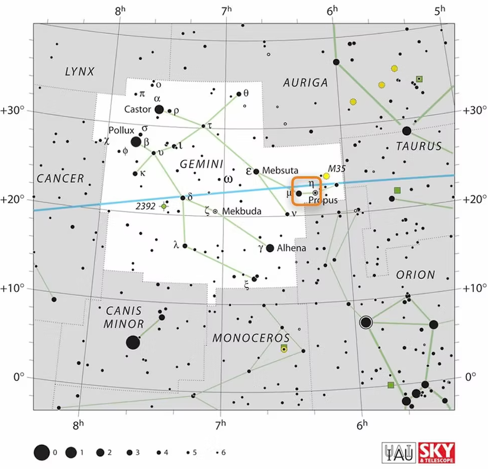 De exacte locatie van de Kwallennevel aan de sterrenhemel.