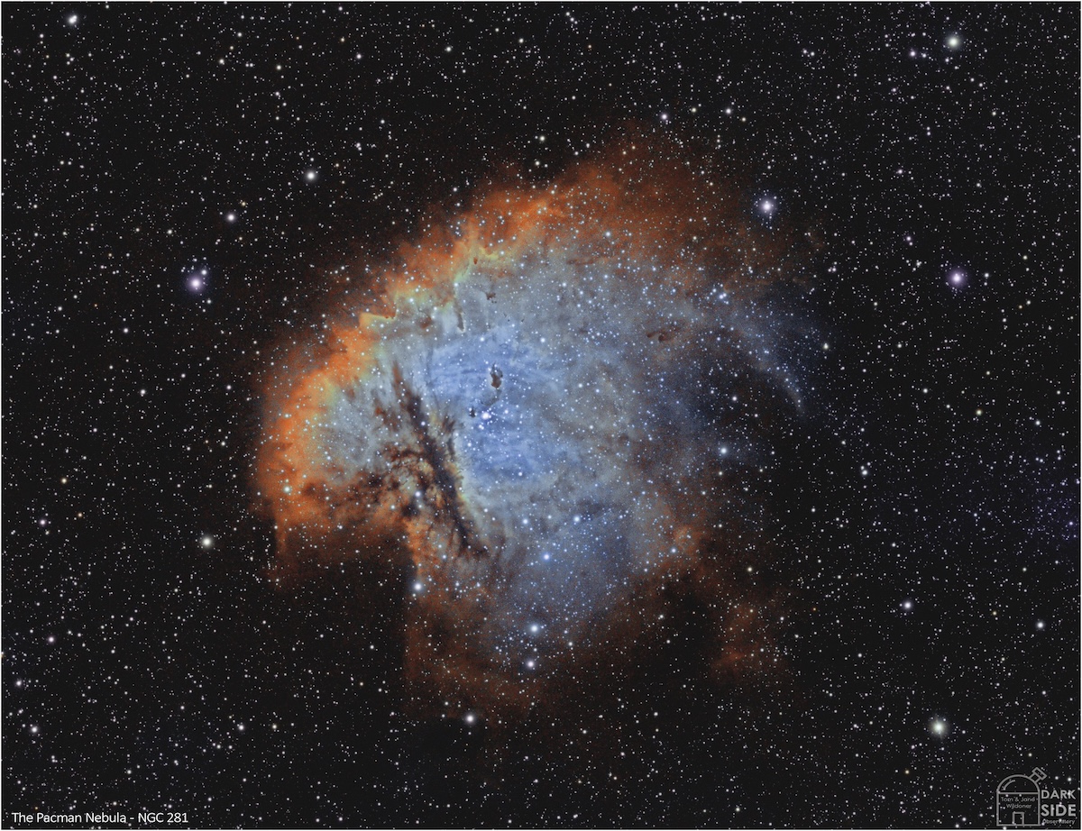 Het is een van de gelukkigste en meest toepasselijke bijnamen in de amateur-astronomie, grappig genoeg om te glimlachen, treffend genoeg om nooit meer te vergeten.Maar de kosmische Pacman verslikt zich in meer dan stipjes. NGC 281 is een van de rijkste en wetenschappelijk meest fascinerende emissinebels aan de herfst- en winterhemel, een actief stervormingsgebied met een indrukwekkende centrale sterrenhoop, spectaculaire donkere stofpijlers die doen denken aan de beroemde Pillars of Creation, een complexe ionisatiestructuur en een reeks van fysische processen die samen een van de meest complete en toegankelijke portretten van actieve stervorming aan de hemel vormen. De Pacman is vrolijk van bijnaam. Van binnen is ze allesbehalve rustig.