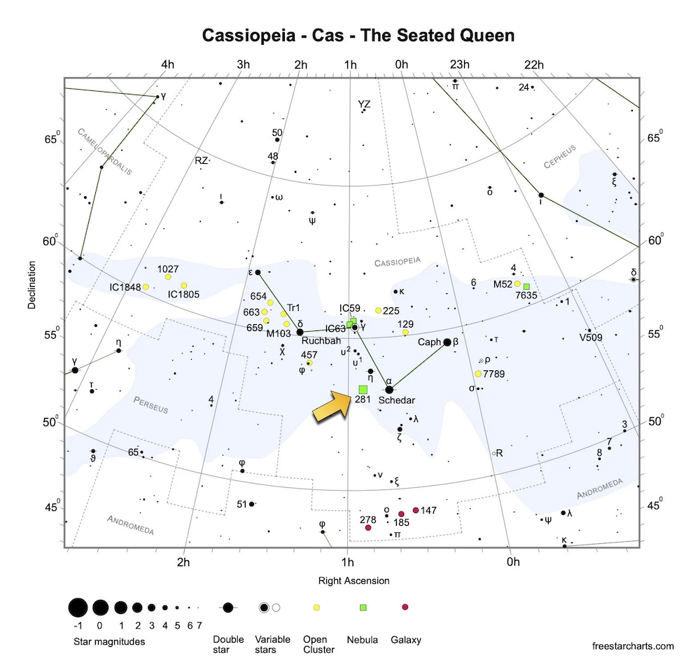 NGC 281 bevindt zich in het sterrenbeeld Cassiopeia, de Koningin, op een rechte klimming van 0u 52m 59s en een declinatie van +56° 37' 19''. Cassiopeia is een circumpolulair sterrenbeeld voor waarnemers op gematigde noordelijke breedtegraden, het daalt nooit onder de horizon vanuit locaties zoals België, Nederland, het Verenigd Koninkrijk of Canada, wat NGC 281 tot een object maakt dat het hele jaar door bereikbaar is. De beste waarnemingsperiode valt van augustus tot januari, wanneer Cassiopeia hoog aan de hemel staat tijdens de avonduren. De afstand tot NGC 281 wordt geschat op ongeveer 9.200 tot 9.500 lichtjaar, wat het object plaatst in de Perseusarm van de melkweg, dezelfde spiraalarm die ook de eerder besproken Californianevel (NGC 1499) en de sterrenhopen van Perseus herbergt. Op die afstand heeft de nevel een schijnbare diameter van ongeveer 35 bij 30 boogminuten, iets groter dan de volle maan, wat haar tot een van de grotere emissinevels aan de herfstwinternachtelijke hemel maakt. De werkelijke fysische diameter bedraagt op basis van de aangenomen afstand ruwweg 100 lichtjaar. De schijnbare magnitude van NGC 281 bedraagt approximately 7,4, maar net als bij alle emissinevels is die geïntegreerde magnitude verdeeld over een groot oppervlak, waardoor de oppervlaktehelderheid per vierkante boogminuut relatief laag is. De nevel is zonder filter visueel moeilijk waarneembaar maar reageert uitstekend op narrowband filters, met name H-alfa en OIII. De ligging in Cassiopeia heeft een bijzondere dimensie: het sterrenbeeld bevindt zich in de richting van de Perseusarm van de melkweg, en de rijke sterrenvelden en nevelcomplexen die Cassiopeia kenmerken zijn de directe uitdrukkingen van de stervormingsactiviteit in die spiraalarm. NGC 281 is slechts één van de vele H-II-gebieden in dit deel van de hemel, maar het is zonder twijfel een van de meest fotogenieke en wetenschappelijk interessante. Voor waarnemers in België en Nederland bereikt Cassiopeia een maximale hoogte van meer dan 70 graden boven de horizon, uitstekend voor zowel visuele waarneming als astrofotografie, met minimale atmosferische verstoring.