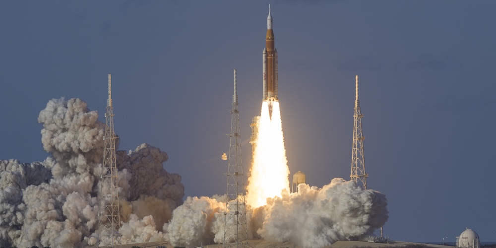De Artemis 2 SLS steeg op van lanceercomplex 39B hier bij het Kennedy Space Center van NASA, en klom de lucht in terwijl de ondergaande zon een gouden gloed wierp op het uitlaatspoor van de raket. Een enorme menigte was getuige van dit moment: experts schatten dat meer dan 400.000 mensen naar Florida's Space Coast waren afgezakt om de maanvlucht te aanschouwen. Ongeveer twee minuten na de lancering scheidde de twee krachtige vaste stuwstofraketten zich af van de hoofdtrap, waarna de vier RS-25-motoren van de raket Orion en zijn bemanning verder de ruimte in stuwden. De SLS wordt aangedreven door dezelfde RS-25-motoren die werden gebruikt door de spaceshuttle-vloot van NASA, en die inmiddels hebben bijgedragen aan het lanceren van 101 astronauten in een baan om de Aarde. Onderdelen van de twee vaste brandstofraketten vlogen ook mee tijdens Space Shuttle missies. In tegenstelling tot die missies zal er echter niets worden hergebruikt van de lancering van Artemis 2. Het duurde ongeveer acht minuten voordat de Artemis 2 SLS een baan om de Aarde bereikte. De bovenste trap van de raket zal in de uren na de lancering twee motorbrandingen uitvoeren om de baan te verhogen en Orion op koers te zetten naar de maan. Artemis 2, dat een vrije-terugkeerbaan volgt die om de maan heen loopt, is in veel opzichten een 21e-eeuwse versie van NASA's Apollo 8-missie, die in 1968 de eerste astronauten om de maan stuurde en tevens de eerste bemande vlucht van de Saturn V-raket markeerde.