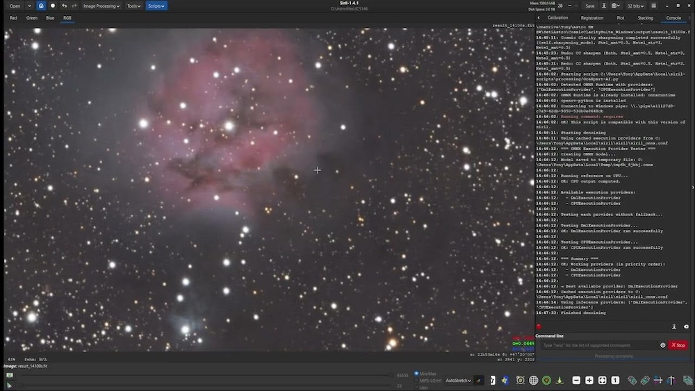 Siril beschikt ook over een indrukwekkend scala aan beeldbewerkingstools. Achtergrondextractie via gradient removal zorgt ervoor dat lichtpollutie en onregelmatige achtergrondhelderheid worden gecorrigeerd. De photometric color calibration koppelt de kleuren in je afbeelding aan reële sterkleurcatalogi, zodat je sterren de juiste, natuurlijke tint krijgen. Stretching van het histogram is cruciaal in astrofotografie, want ruwe opnames lijken bijna volledig zwart totdat je de juiste verdeling aanbrengt. Siril biedt zowel handmatige als automatische stretchmethoden, waaronder de populaire GHT (Generalised Hyperbolic Transformation) die bijzonder veel controle geeft over de balans tussen achtergrond en hooglichten. Sterren verwijderen en terugplaatsen is een steeds populairdere techniek geworden, en ook daarvoor heeft Siril een ingebouwde Starnet++-integratie beschikbaar. Hiermee kun je de sterren tijdelijk verwijderen, de nevel of melkweg apart bewerken, en de sterren daarna weer netjes samenvoegen met het eindresultaat.