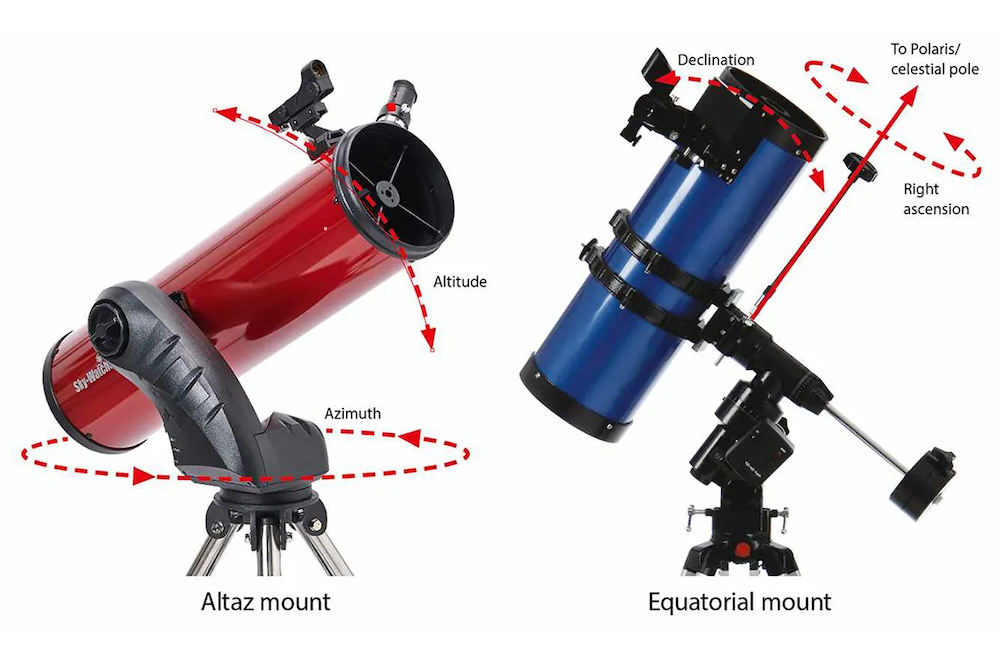 Om de voordelen en nadelen van de alt-az montering goed te begrijpen, is het nuttig die te vergelijken met het grote alternatief: de equatoriale montering. Een equatoriale montering heeft één as die parallel loopt aan de aardas, de zogenaamde poolse as of rechte klimming-as. Doordat die as met de aarde meedraait, volgt een object aan de hemel automatisch als je slechts die ene as met een constante snelheid laat draaien. Dit noemt men tracking of navolging, en het is bijzonder handig bij fotografische toepassingen. Een alt-az montering heeft dit inherente voordeel niet: om een object te volgen terwijl het door de hemel beweegt, moeten beide assen tegelijkertijd en met wisselende snelheid worden aangedreven, wat alleen met computersturing mogelijk is.