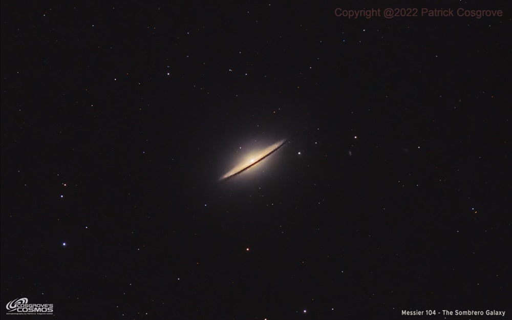 Hoewel technisch in Virgo, ligt de Sombrero Galaxy zuidelijk en apart van het hoofdcluster. Dit is een van de meest fotogenieke sterrenstelsels aan de hemel. Met magnitude 8,0 is M104 gemakkelijk te vinden. Het karakteristieke profiel, een grote centrale bulge met een prominente donkere stofband - is het handelsmerk van dit stelsel. Met een 15 cm telescoop is het zichtbaar als een langwerpige nevel. Bij 20 cm opening wordt de stofband waarneembaar als een donkere lijn door het stelsel. Met 30+ cm opening wordt de stofband prominent en is de grote centrale bulge indrukwekkend. Fotografisch is de Sombrero Galaxy spectaculair. Zelfs korte belichtingen tonen de dramatische structuur. Langere belichtingen (3-5 uur) onthullen de enorme halo van bolvormige sterrenhopen, complexe details in de stofband, en de subtiele structuur van de schijf.