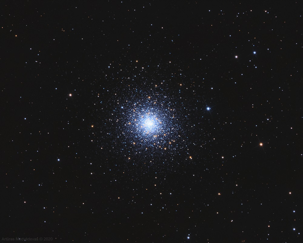 M13 staat in juni op zijn absolute best, hoog boven het zuiden met minimale atmosferische verstoring. Dit is waarschijnlijk de beste maand van het jaar voor dit spectaculaire object. Met magnitude 5,8 is M13 gemakkelijk te vinden, zelfs in de niet-volledig-donkere juninachten. Met het blote oog is het een zwakke vlek onder redelijk donkere omstandigheden. Met een verrekijker wordt het duidelijker als een nevelige bol. De magie begint met telescopen. Bij 10 cm opening begint M13 al mooi op te lossen in individuele sterren aan de randen. Bij 15-20 cm opening is de view spectaculair, honderden sterren lossen op over het hele gezichtsveld. De karakteristieke vorm met uitstekende "armen" van sterren wordt zichtbaar. Met 25-30 cm opening is M13 adembenemend. Duizenden sterren zijn zichtbaar, ketens van sterren stralen uit van de heldere kern, en de beroemde "propeller" donkere gebieden worden zichtbaar. Bij 40+ cm opening onder goede omstandigheden kunnen zwakke gebieden vlakbij de kern geresolveerd worden, en het totale aantal zichtbare sterren is overweldigend. M13 ligt op ongeveer 22.000 lichtjaar afstand en bevat meer dan 300.000 sterren in een gebied van ongeveer 145 lichtjaar doorsnee. Het is ongeveer 11,65 miljard jaar oud. Voor fotografen is M13 een prachtig doelwit dat relatief korte belichtingstijden vereist. 1-2 uur totale integratietijd kan al spectaculaire resultaten geven. De helderste sterren hebben verschillende kleuren, voornamelijk rode reuzen en gele sterren, die fotografisch goed naar voren komen. - M92