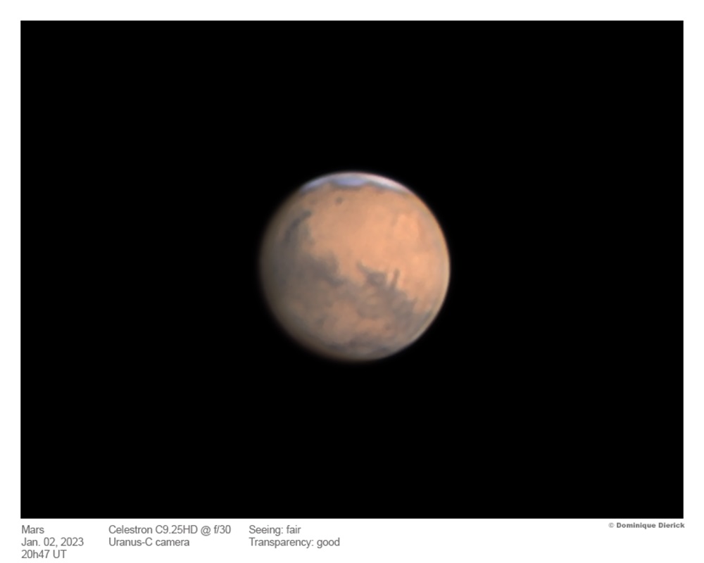 Mars gefotografeerd met een Celestron C9 telescoop door Dominique Dierick.