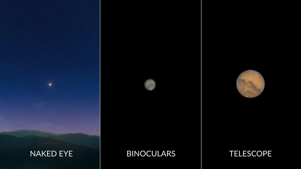 • Waarneming met een verrekijker: Een verrekijker toont Mars als een klein oranje schijfje, maar de beperkte vergroting maakt het onmogelijk om oppervlaktedetails te zien. Tijdens gunstige opposities kan een zeer stabiele verrekijker met hoge vergroting (bijvoorbeeld 15x70 of 20x80 op een statief) een suggestie geven van de grootste donkere oppervlaktefeatures, maar dit blijft uitdagend. De waarde van een verrekijker voor Mars waarnemingen is beperkt, en voor zinvolle observaties is een telescoop noodzakelijk.