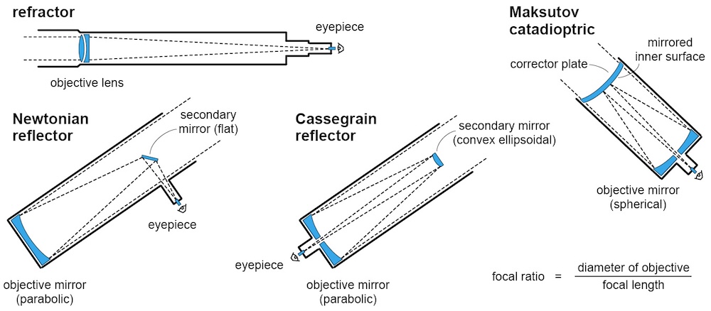 De kern van elke telescoop is het verzamelen van licht. Dit gebeurt via twee fundamenteel verschillende methoden: refractie (breking) door lenzen, of reflectie (weerkaatsing) door spiegels. Een lens werkt op basis van het principe dat licht zijn richting verandert wanneer het van het ene medium (lucht) naar het andere (glas) overgaat. Een bolle lens convergeert parallel invallend licht naar één punt: het brandpunt. De afstand van de lens tot het brandpunt heet de brandpuntsafstand of focuslengte (in het Engels: focal length, aangeduid met f). Een spiegel werkt anders: een holle, parabolische spiegel reflecteert licht zodanig dat alle parallelle lichtstralen samenkomen in één brandpunt. Het principe is wiskundig equivalent aan een lens, maar heeft het voordeel dat er geen kleurscheiding optreedt, omdat licht bij reflectie geen dispersie ondergaat.