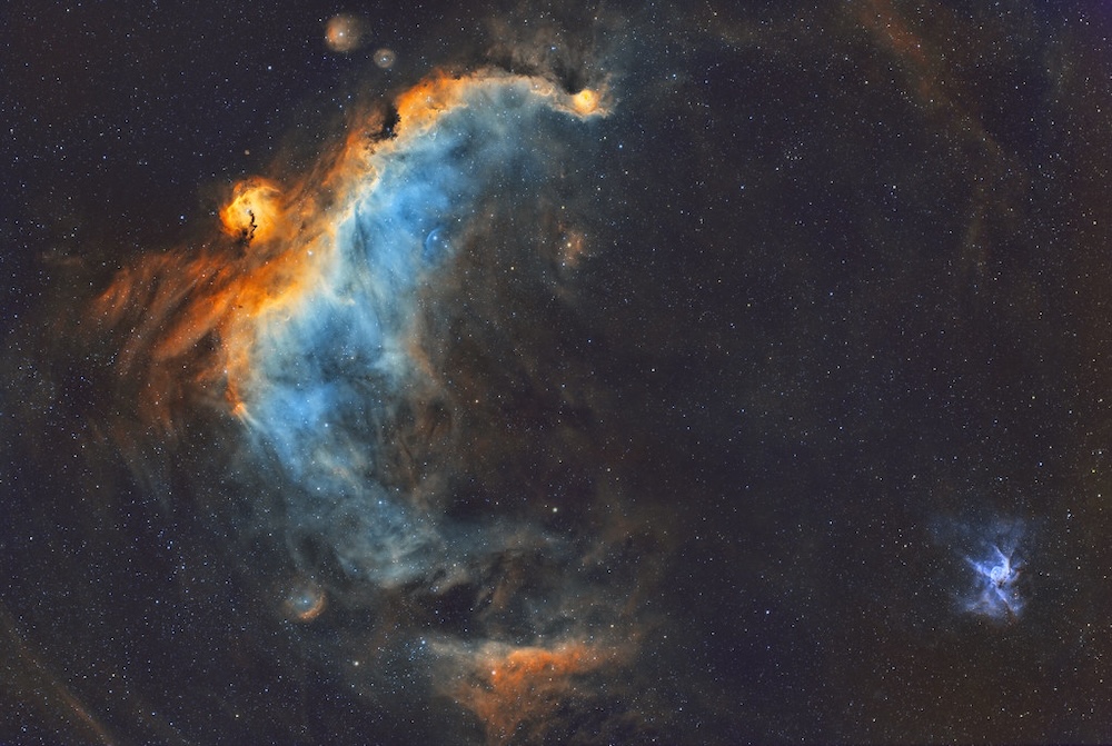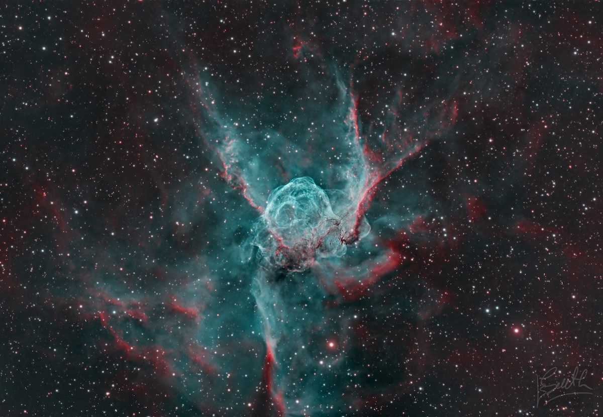 Als er één deep-sky object bestaat waarvan de bijnaam perfect past bij wat je door een telescoop of op een astrofoto ziet, dan is het wel NGC 2359. De Helm van Thor (Thors' Helmet), vernoemd naar de Noorse god van de donder, is een van de meest fotogenieke en wetenschappelijk fascinerende emissinevels aan de nachtelijke hemel. Met zijn karakteristieke bolvormige "helm" geflankeerd door twee uitgestrekte "vleugels" of "hoorns" lijkt het alsof de hemel zelf een wapenrusting draagt. Maar achter die mythologische schoonheid schuilt een verhaal van kosmisch geweld, extreme sterrenfysica en onvermijdelijke ondergang.